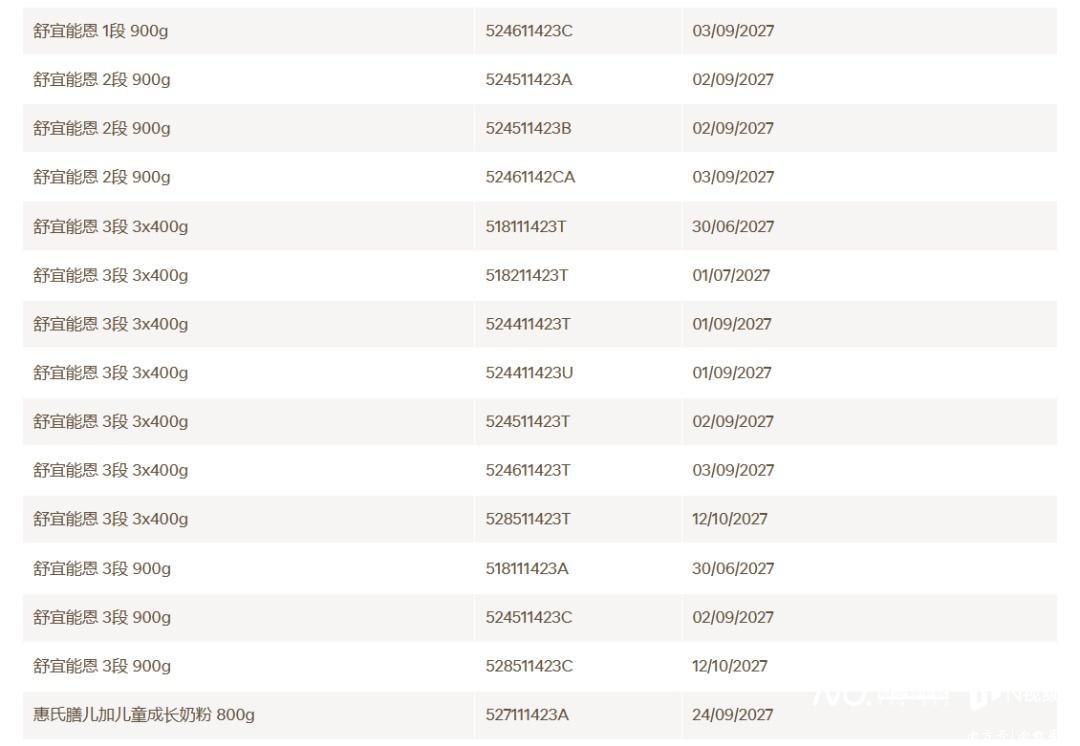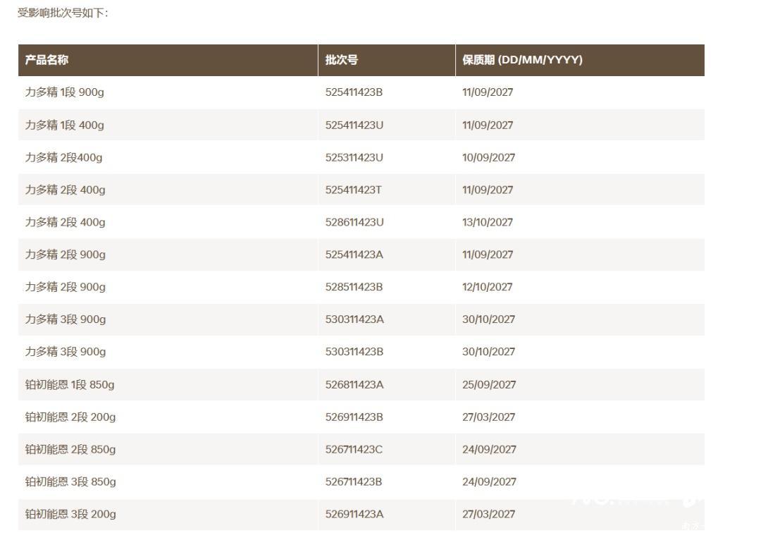 而雀巢中国1月6日发布的公告显示,本次在中国大陆召回的产品品牌涉及力多精、能恩以及惠氏,共计30批次产品,这些产品的保质期均至2027年。