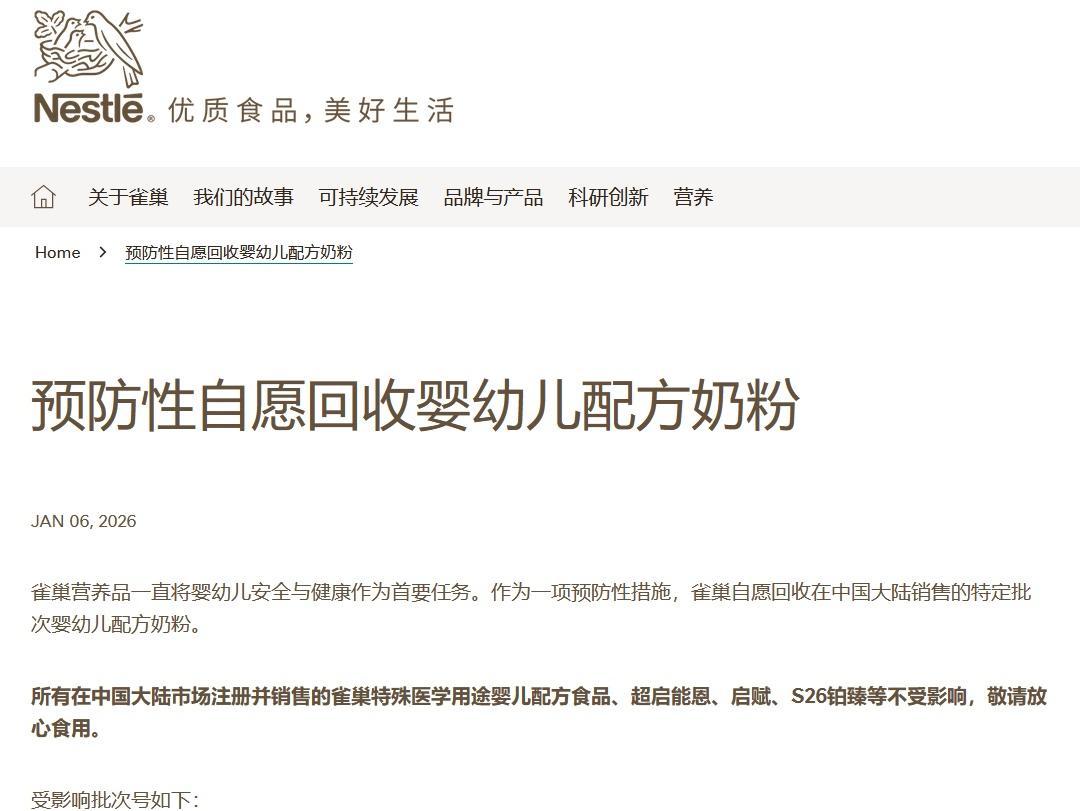 南都湾财社记者注意到,次日(1月6日),雀巢中国官网亦发布公告称,作为一项预防性措施,自愿回收在中国大陆销售的特定批次婴幼儿配方奶粉。